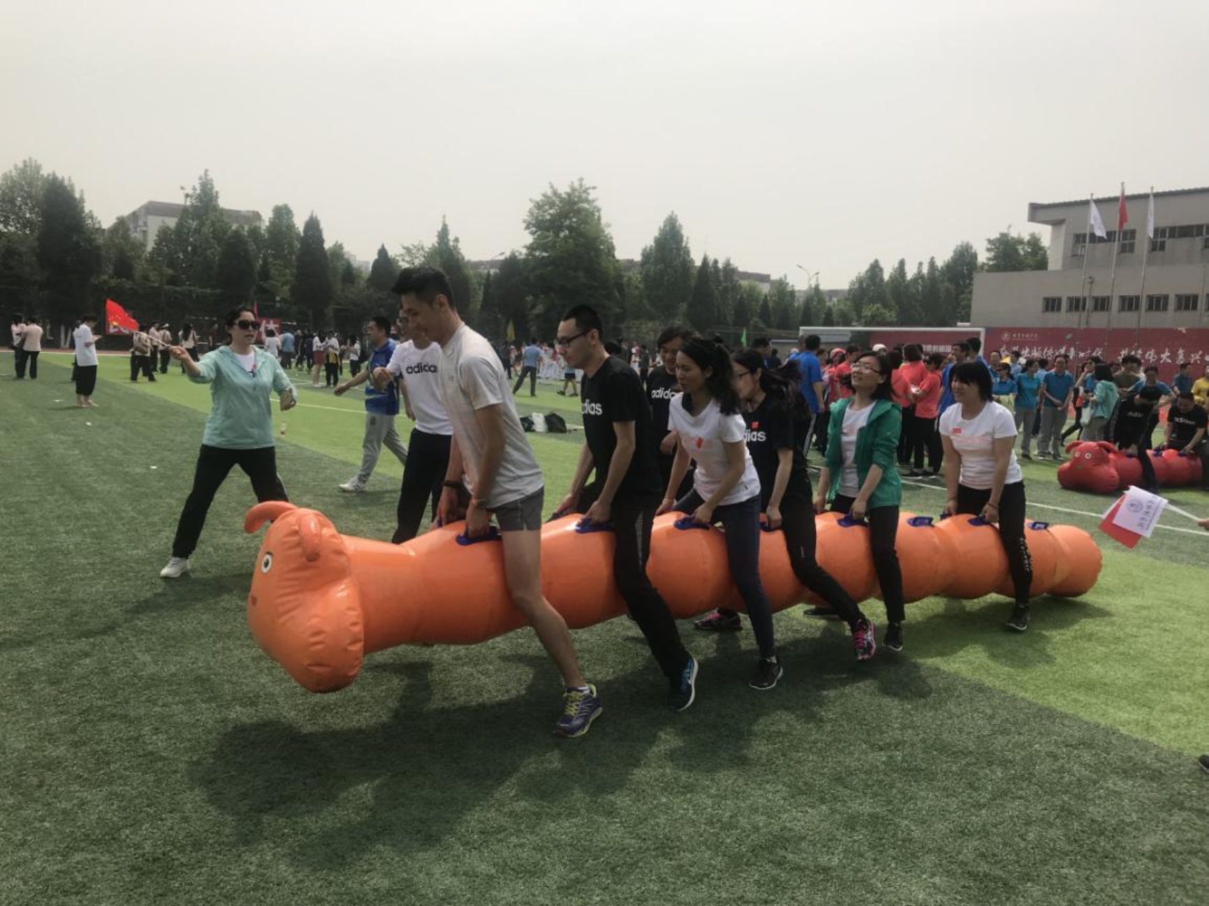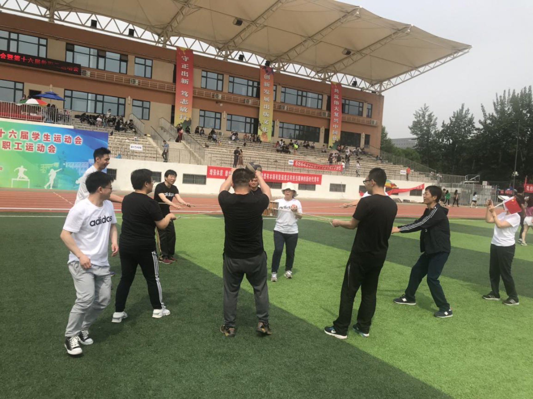 与此同时,学院教职工们也在挥洒着汗水:他们同心协力,在4x100米接力、疯狂毛毛虫、击鼓颠球等项目中彰显教师品格和时代风貌。